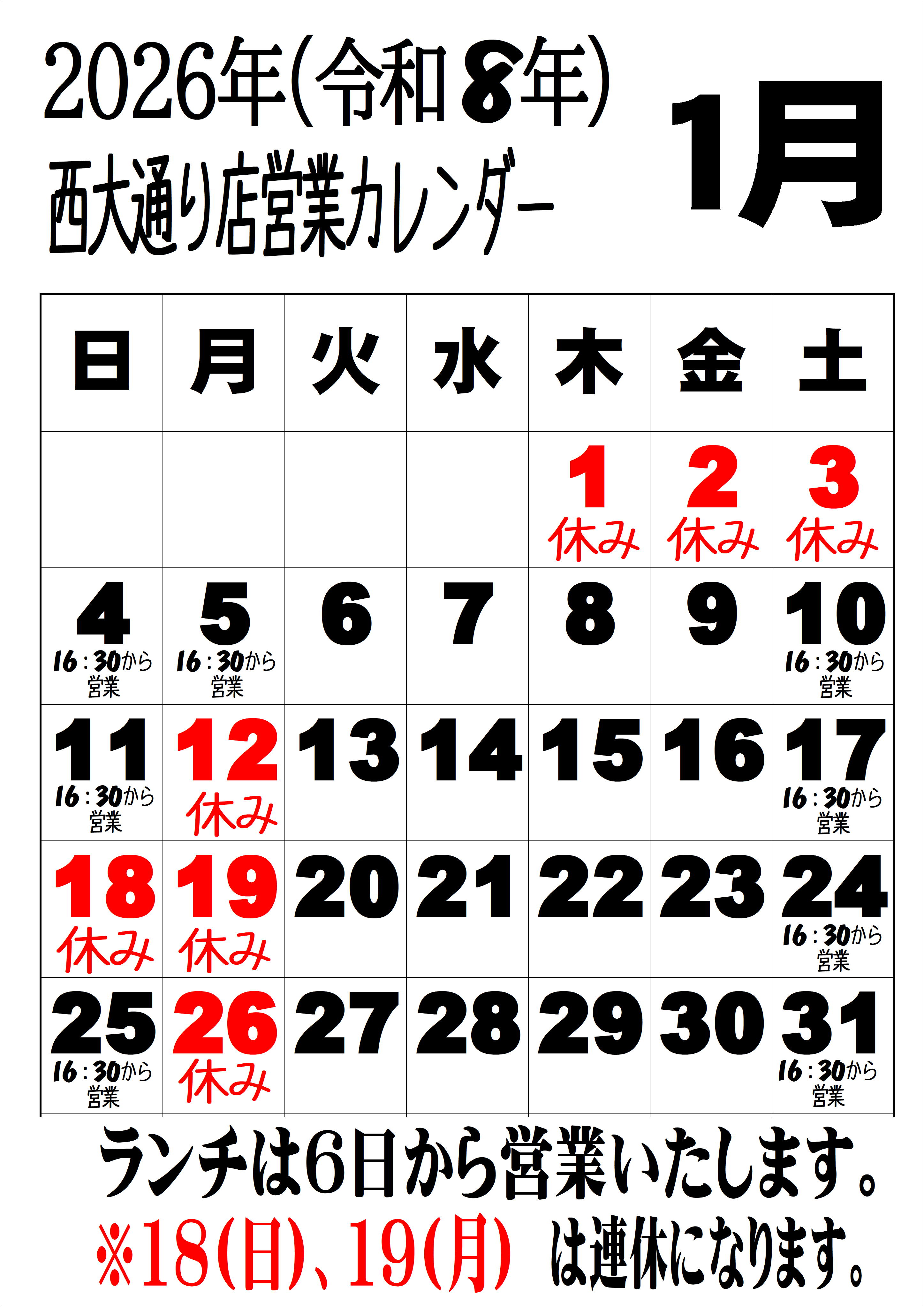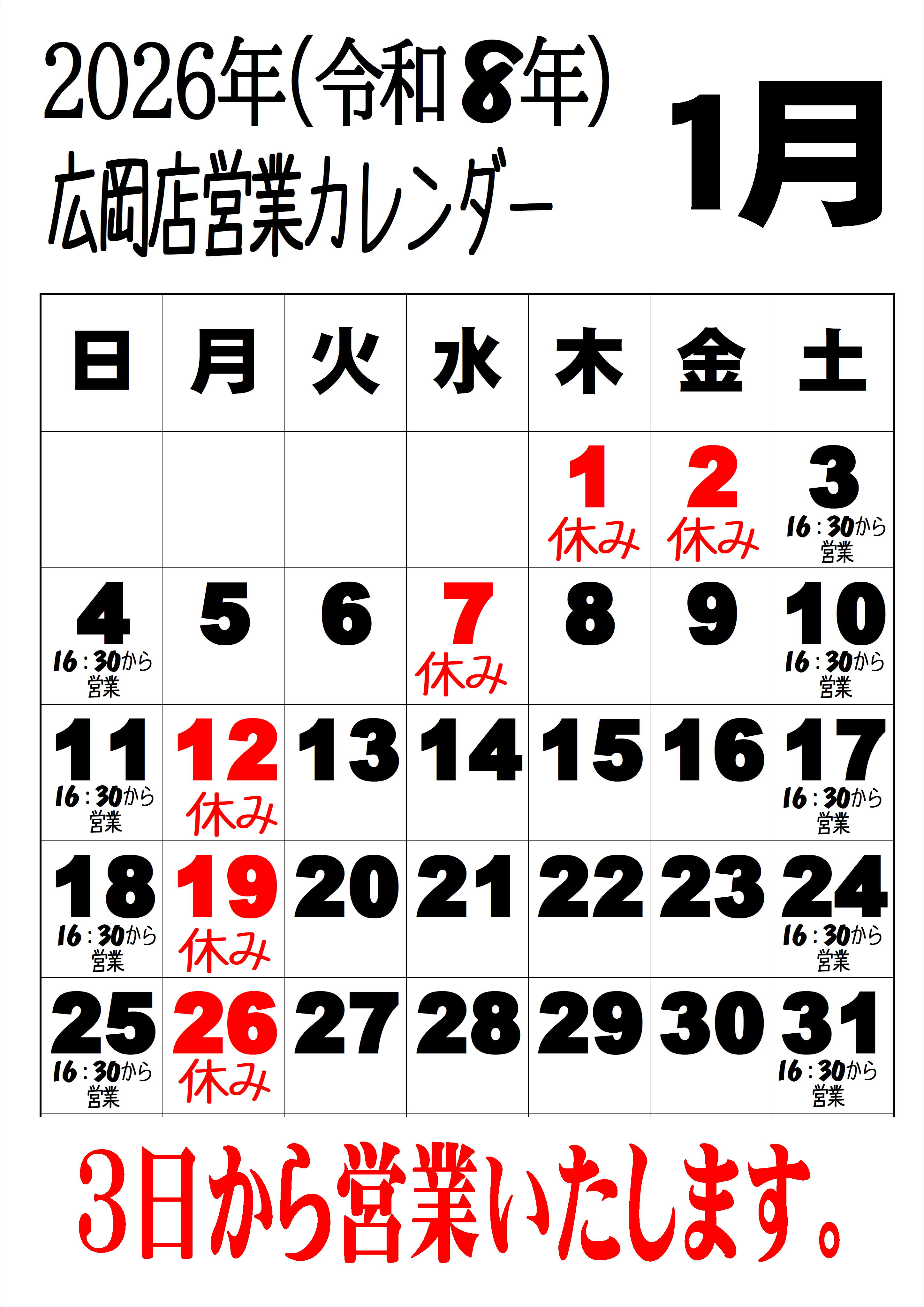 ※2026年は1月4日(日)16:30から営業いたします。